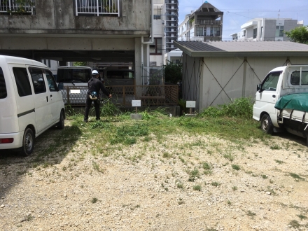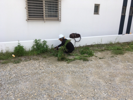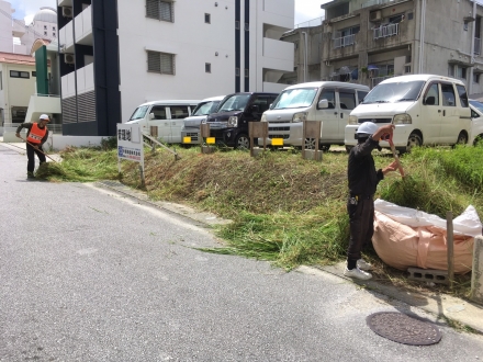 工事期間中お借りしている駐車スペースの草刈りや現場周辺の清掃を行いました。