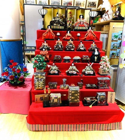 インターホン越しに明るい声で応答、案内いただいた玄関の正面には、素敵な雛壇飾りがあり、その隣には鮮やかなチューリップの生け花も♪