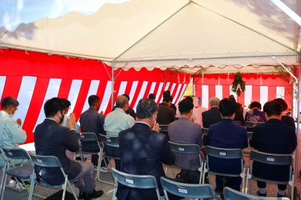 曇りだった予報も見ての通り青空が広がりとても気持ちのいい天気となりました。施主様のお人柄を表すようなやさしい太陽に包まれて、参加者全員で工事の安全を祈願。工期は今月から来年6月末までの予定です。